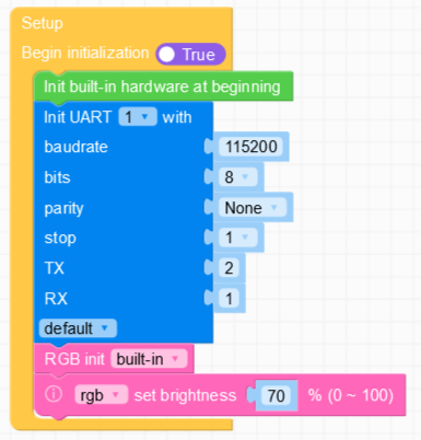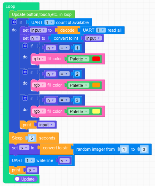 To demonstrate that it is working, a random number is sent and when received used to change the colour of the LED. Note that the UART number used is UART1. UART 2 has also been tested and works. UART 0 is presumably used for the USB communication and didn’t work in this program.
